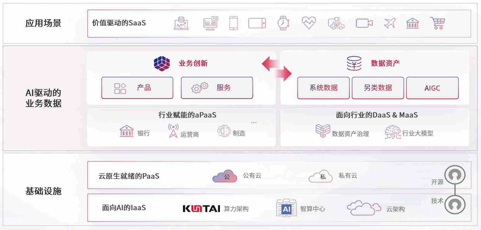 数字时代,,围绕企业数字化转型的关键要素,,糖心vlog数码开创性的提出数云融合战略和技术体系框架,,着力在云原生、、、数字原生、、、、AI原生和信创产业上架构产品和服务能力,,,为处在不同数字化转型阶段的快消零售、、汽车、、、、金融、、医疗、、政企、、、、教育、、运营商等行业客户提供泛在的敏捷IT能力和融合的数据驱动能力,,构建跨界融合创新的数字业务场景和新业务模式,,,助力企业级客户建立面向未来的核心能力和竞争优势,,,全面推动社会的数字化、、、、智能化转型升级。。。。