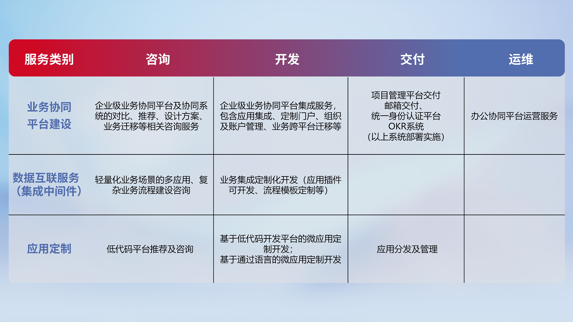 针对钉钉、、、、企微、、、、IDaas等平台级产品提供产品的规划、、方案、、、交付、、定制化开发等服务,,,,实现如统一协同办公、、、智能客户服务、、、、混合会议管理、、、、智能数据查询、、、等业务场景,,,实现数字化转型。。。